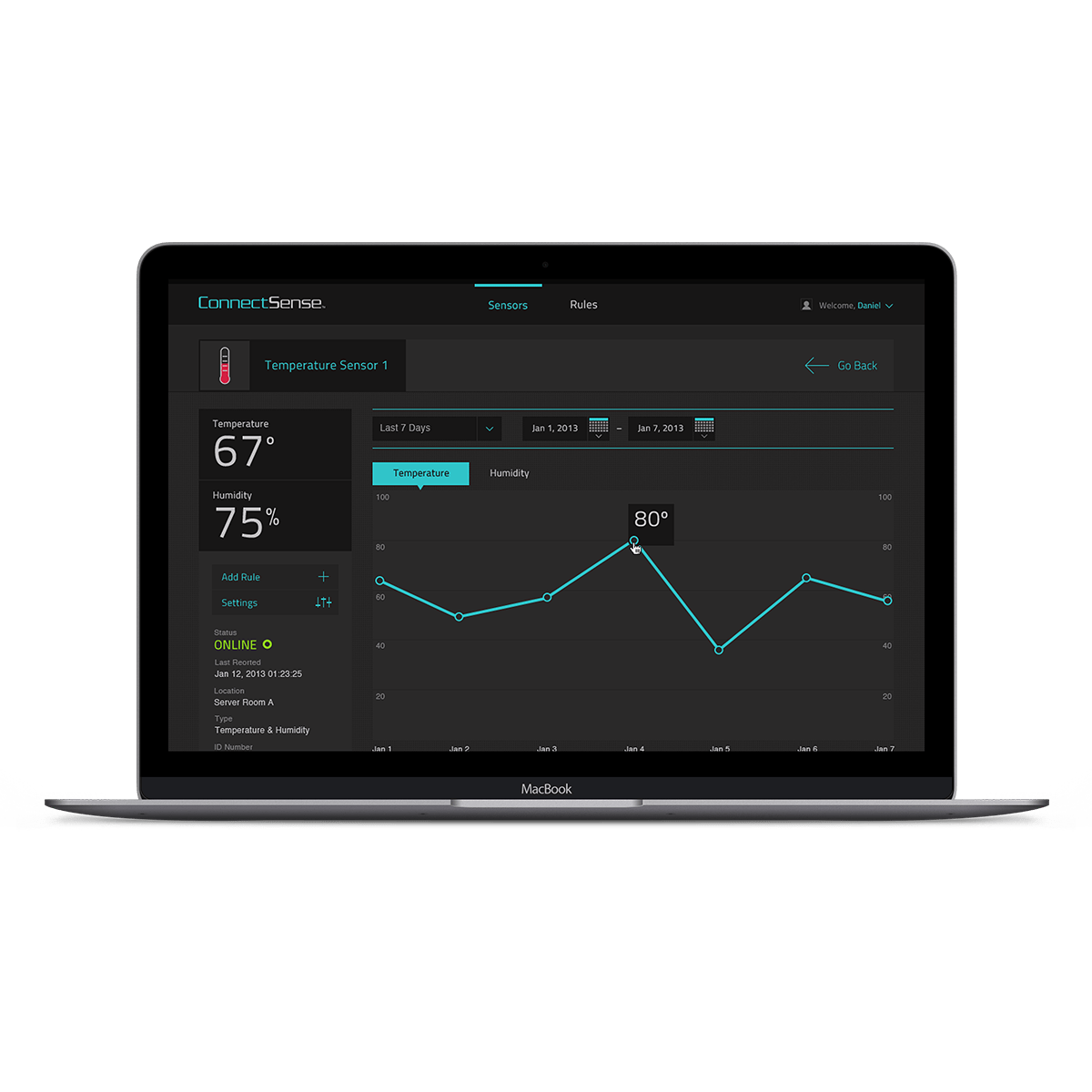 Hashrocket designed and developed a unique workflow for homeowners to set up sensors via WiFi or a USB connection. The system lets users create custom rules for sensors that trigger events, including strobes and sirens for security purposes, or even calling the homeowner if their basement is flooding. With a custom–built reporting engine, all the user’s data is securely stored with easy–to–read visualizations.